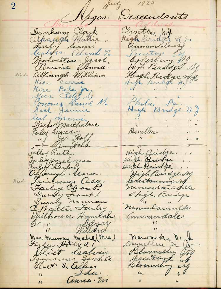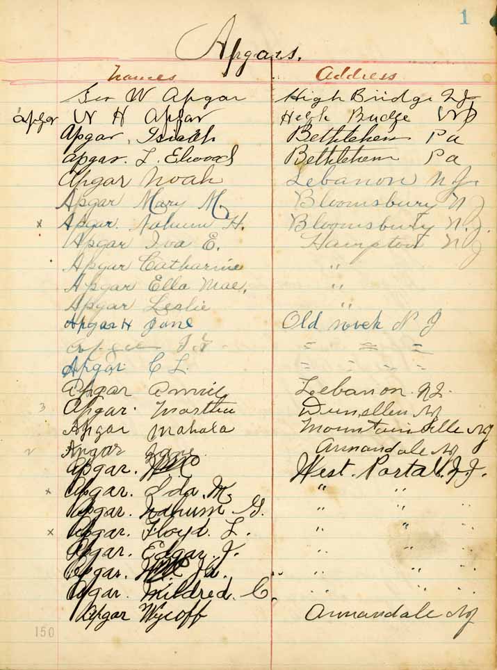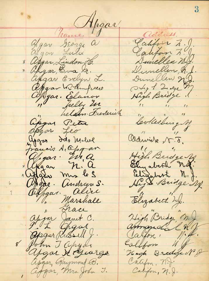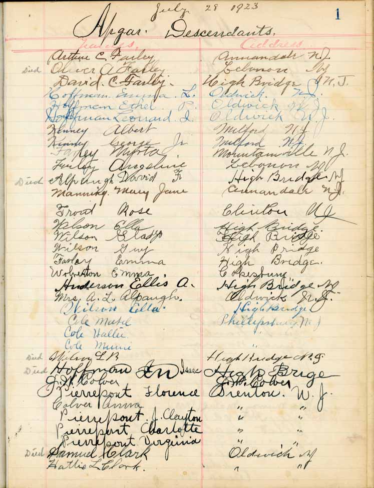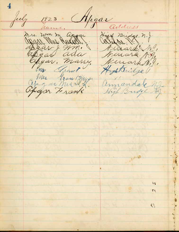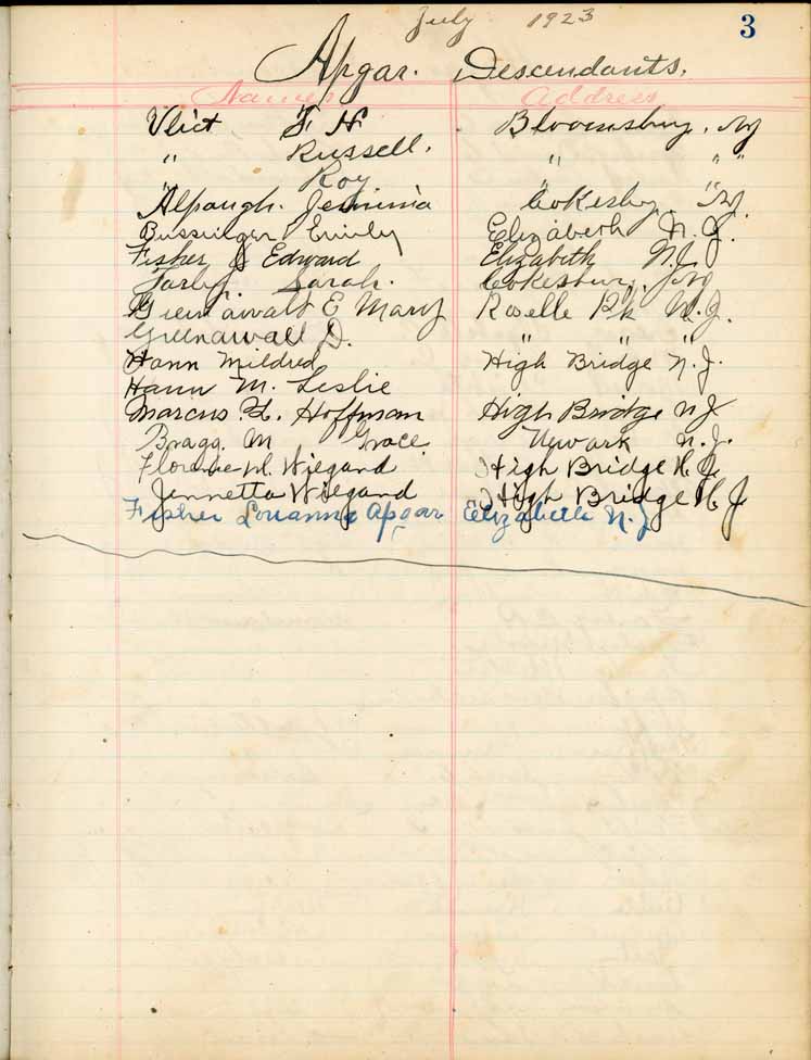 Saturday, July 28, 1923Riverside Park, High Bridge NJ Apgars p. 1 of 4 Apgars p. 2 of 4 Apgars p. 3 of 4 Apgars p. 4 of 4 Apgar Descendants p. 1 of 3 Apgar Descendants p. 2 of 3 Apgar Descendants p. 3 of 3